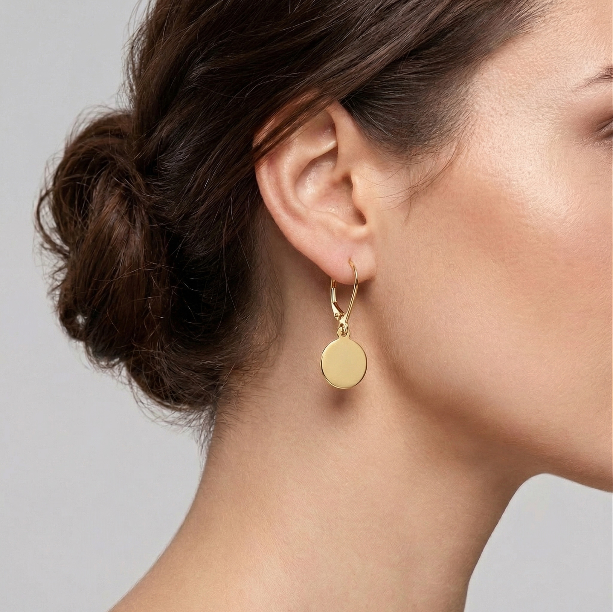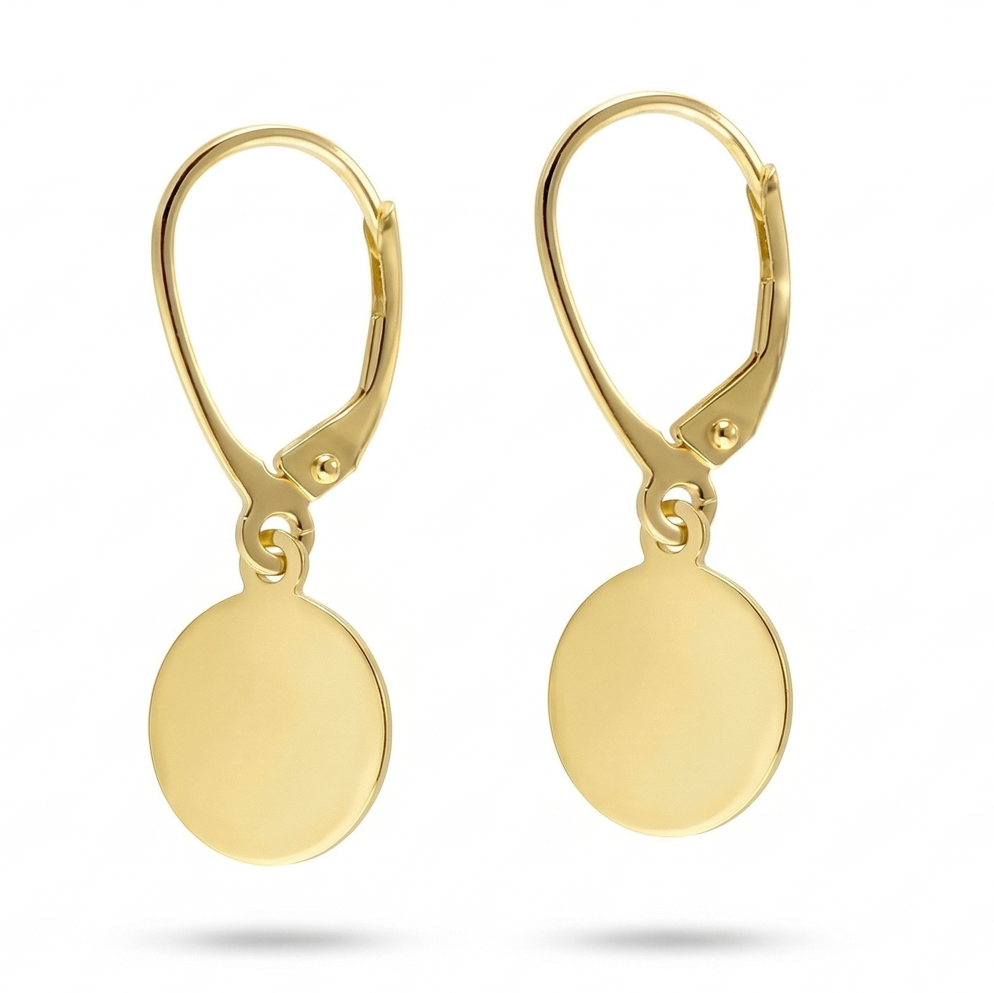 Złote kolczyki wiszące zapinane na bigiel  w kształcie kółek. Nabity numerator potwierdza próbę złota z której zostały wykonane.
