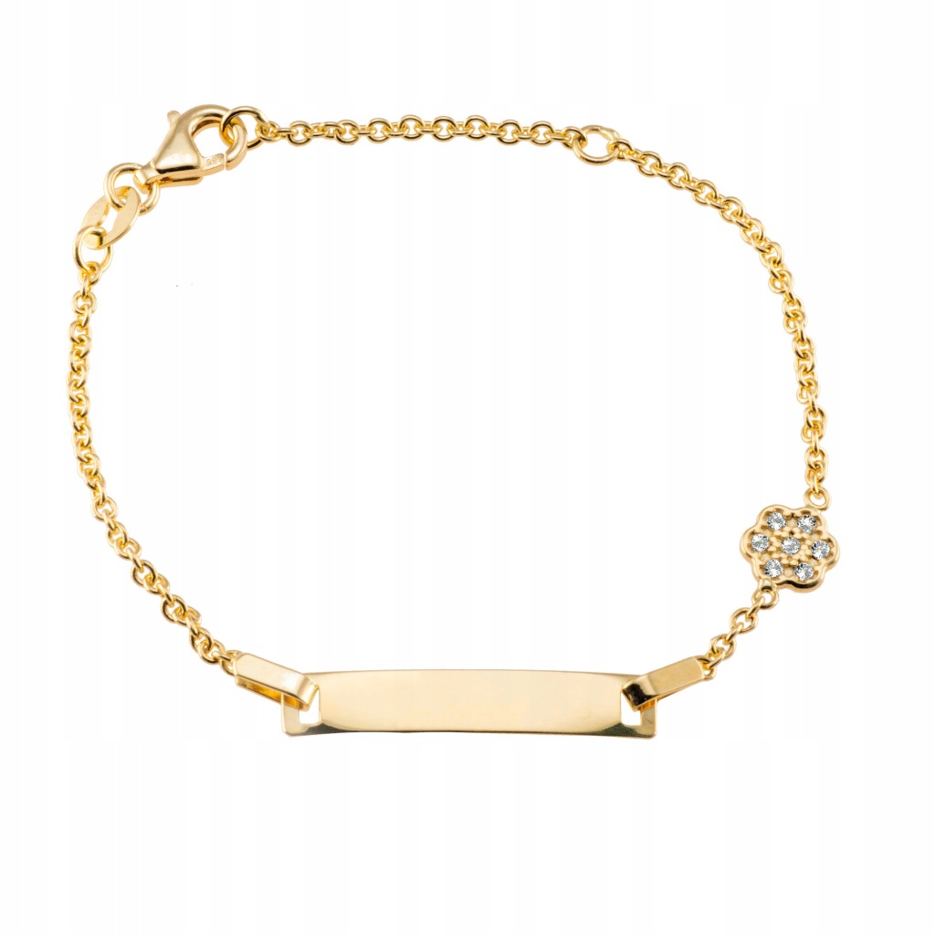 Bransoletka z kwiatuszkiem wysadzanym cyrkoniami oraz umieszczoną na środku blaszką.
